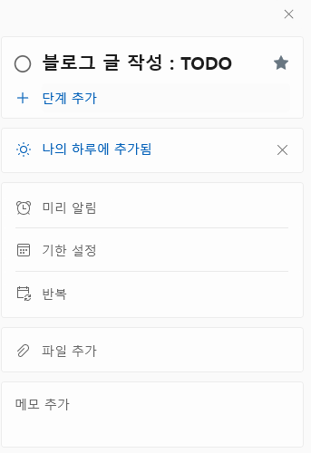 할일을 추가하면 위처럼 단계(서브태스크)를 추가하거나 기한/반복/파일/메모를 추가할 수 있다