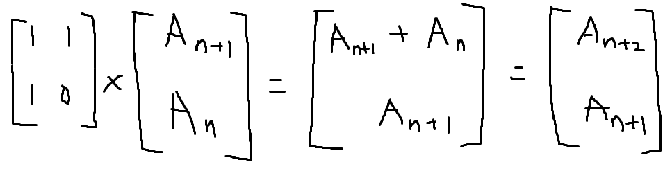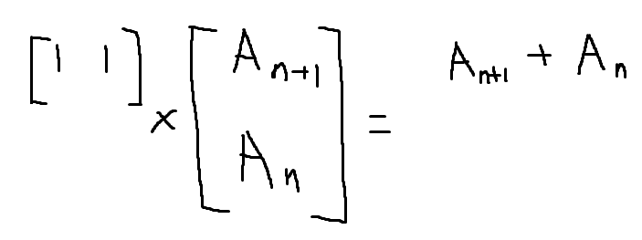 이렇게 1*2 행렬과 2*1 행렬의 곱으로 피보나치 수열의 형태를 만들 수 있다