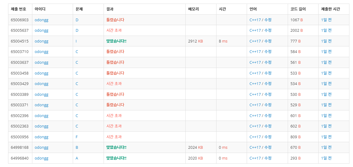 | AtCoder Beginner Contest 310 후기 (ABC 310 3솔) /// 앳코더 잠시 중단 (1) | 2023.07.15 |